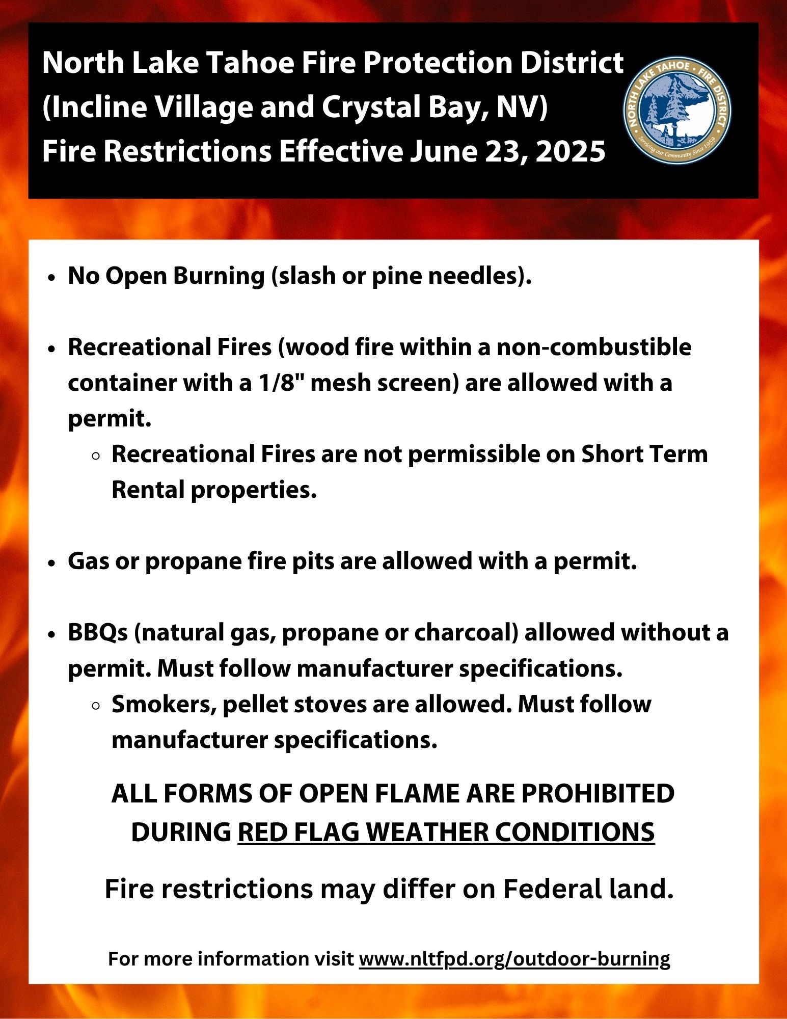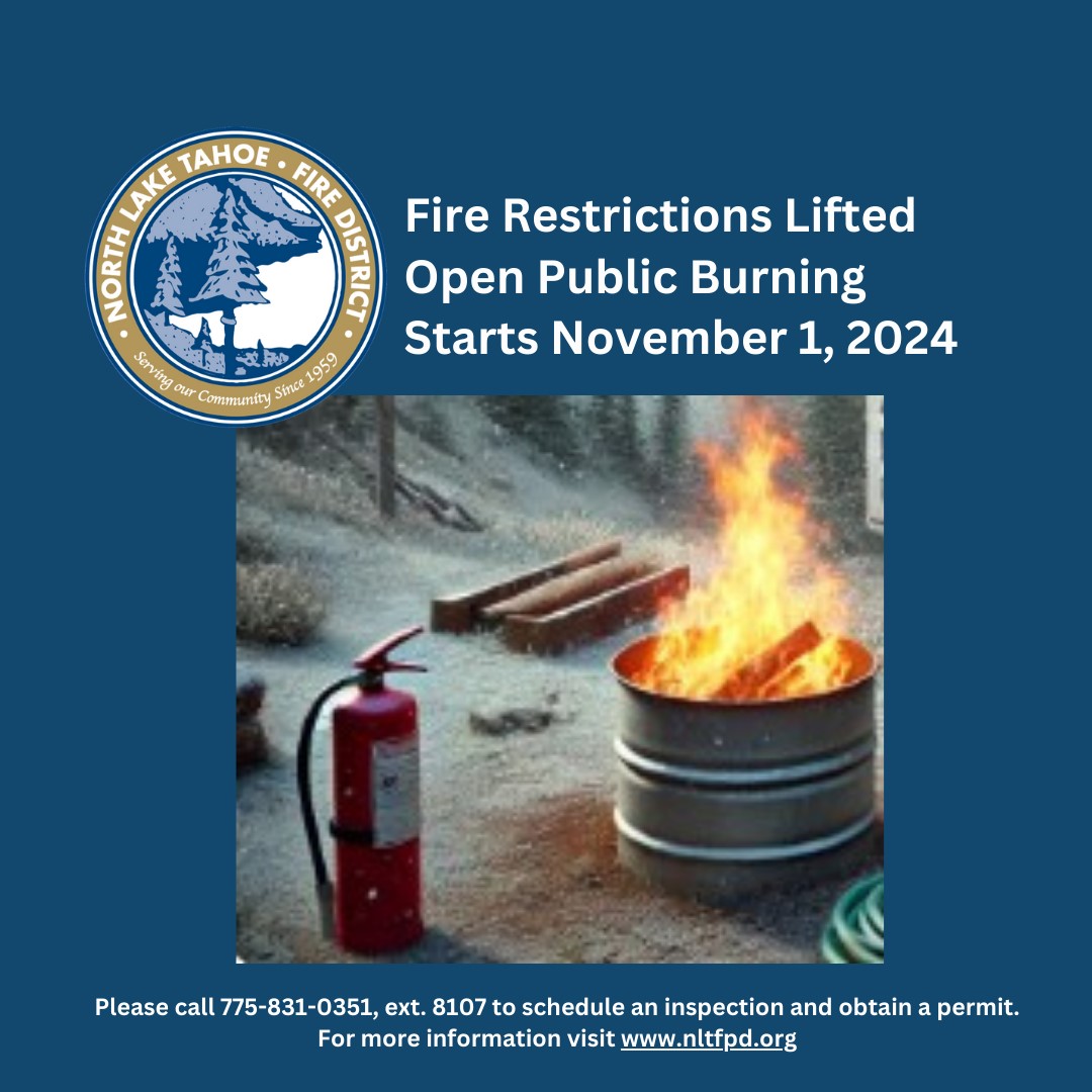 With the arrival of moisture, higher humidity, and winter weather conditions, effective Friday, October 17, 2025, outdoor burning is permissible in Incline Village and Crystal Bay, NV.